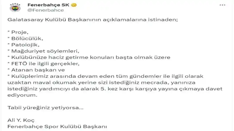 * ⁠Kulüplerimiz arasında devam eden tüm gündemler ile ilgili olarak uzaktan maval okumak yerine sizi istediğiniz mecrada, yanınıza istediğiniz yardımcıyı da alarak 5. kez karşı karşıya yayına çıkmaya davet ediyorum. Tabii yüreğiniz yetiyorsa…" denildi.