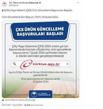 Bakanlık tarafından yapılan duyuruya göre ürün güncelleme başvurularının son tarihinin ise 29 Şubat 2024 olduğu belirtildi. Bu tarih, çiftçilere sağlanan başvuru sürecini tamamlamak için son fırsat olarak belirtildi.