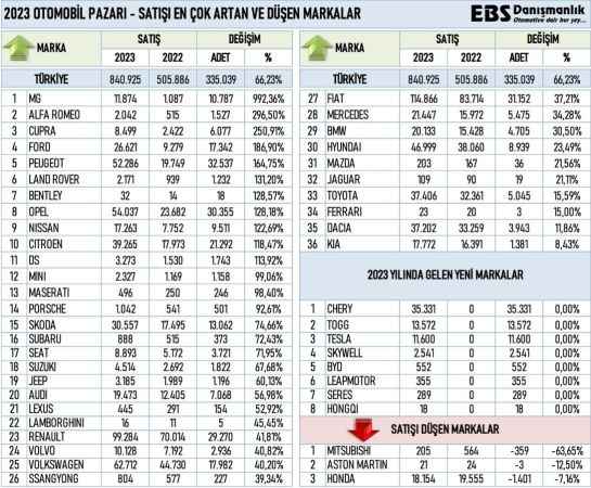 Otomobil gazetecisi Emre Özpeynirci, sosyal medya hesabından paylaştığı tabloda 2023’ün 11. Ayına kadar Türkiye’de en çok ve en az satan araba makaralarını sıraladı. Özpeynirci EBS Danışmanlığın gerçekleştirdiği “2023 Otomobil Pazıo – Satışı En Çok Artan ve Düşen Markalar” araştırmasının sonucunda en dikkat çeken ise MG (Morris Garages) oldu.