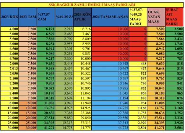 Erdursun'un paylaştığı tabloya göre, çoğu emeklinin kök maaşı üzerinden alacağı emekli maaşı ayrı ayrı olacak. Tablonun dikkat çeken yanı ise 6 bin 700 TL ve altında kök aylığı olan emeklilerin en düşük emekli aylığını alması oldu.