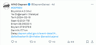 İçişleri Bakanlığı Afet ve Acil Durum Yönetimi Başkanlığı'ndan (AFAD) yapılan açıklamaya göre, saat 12.23 sularında Malatya Doğanşehir'de 4.3 büyüklüğünde deprem meydana geldi. Deprem yerin 17,7 km derinliğinde gerçekleşti.