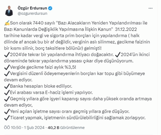 "Son olarak 7440 sayılı ''Bazı Alacakların Yeniden Yapılandırılması ile Bazı Kanunlarda Değişiklik Yapılmasına İlişkin Kanun'' 31.12.2022 tarihine kadar vergi ve sigorta prim borçları için yapılandırma gelmişti! (halk dilinde af ancak bu bir af değildir, verginin aslı silinmez, gecikme faizinin bir kısmı silinir, borç taksitlere bölünür)” ifadelerini kullandı.