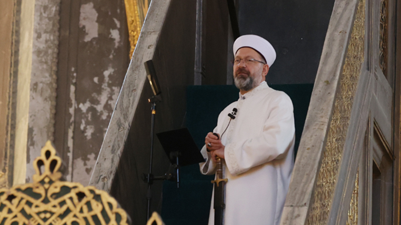 Diyanet İşleri Başkanı Ali Erbaş, bugün Ayasofya Camii’nde Cuma namazı kıldırdı. “Hayatın tekrarı yok” başlıklı hutbeyi kılıçla okudu.
